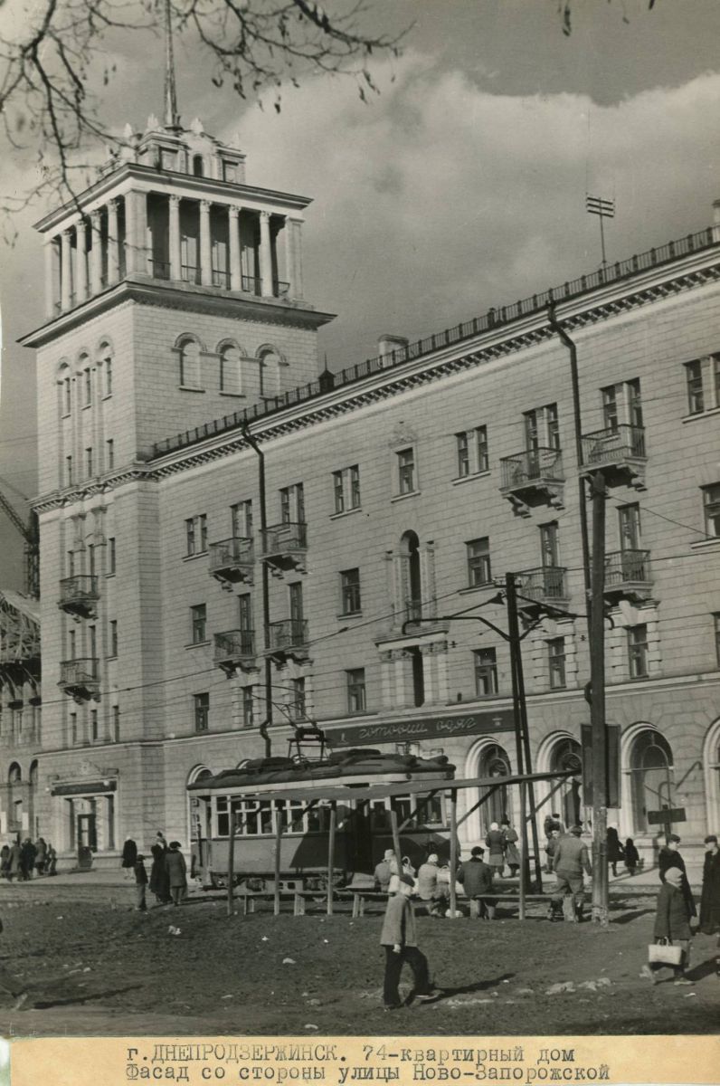 Первая послевоенная строительная площадка появилась на месте бывшего сельского кладбища, где на то время располагался городской рынок. Первое здание - дом 1/2 по ул. Ново-Запорожской - по проекту архитекторов Олега Петрова и Израиля Виленчика было завершено в 1951 году. На всеукранском конкурсе он был удостоен третьей премии. Учитывалась не только красота фасада, но и то, что впервые в области авторы проекта внедрили в строительство использование железобетонных конструкций - цельносборные железобетонные лестничные марши, балконы, плиты перекрытий. А наверху в башне  размещались два бойлера для горячей воды по 3600 литров каждый. Как ни прискорбно, но это разрушает легенду о безумном художнике, имевшем якобы там мастерскую. В доме была котельная и бойлерная. На строительство дома было потрачено 4.2 млн. руб.  в ценах того времени. Стоимость 1 квадратного метра составляла 1 256 руб. ( средняя зарплата по СССР была 600 руб.) Среди 74 квартир было всего 2 однокомнатые и 19 трехкомнатых. Надо заметить, что однокомнатная квартира по тем временам была роскошью, потому что отдельная, без подселения!